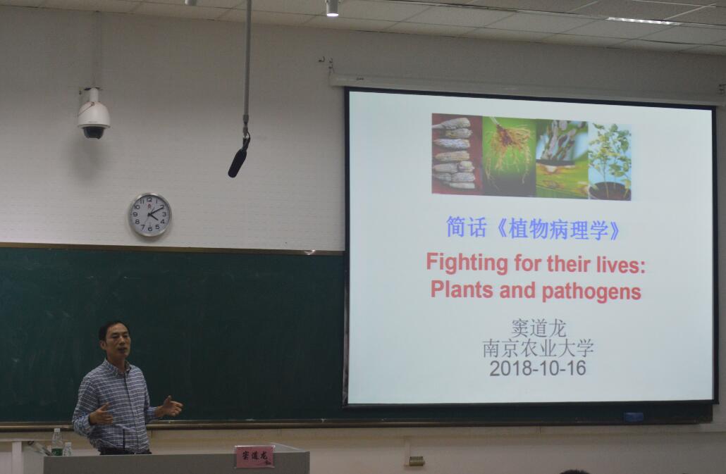 本次讲堂由窦道龙教授主讲《简话<植物病理学>》,激发了同学们对植物病理学科的强烈兴趣。窦老师以Fighting for their lives: Plants and pathogens为题,用拟人化的语言,将植物与病原物在漫长的进化过程中的艰难生存斗争娓娓道来。从植物病害的概念、病原物和致病途径、植物的抗病过程和病害控制方法,到“植物医生”的职业定位和重要价值,窦老师由浅入深,向大家做了准确详细的介绍。