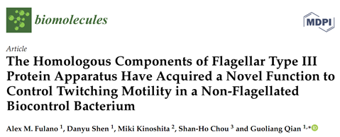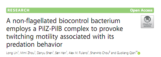 1. 无鞭毛OH11通过感知病原菌的信号,利用复杂的信号网络调控细胞表面纳米级IV型菌毛的伸缩,驱动其在固体界面的蹭行运动--twitching motility来接近病原菌 --图1 (Lin et al., 2020, Phytopathology Research)