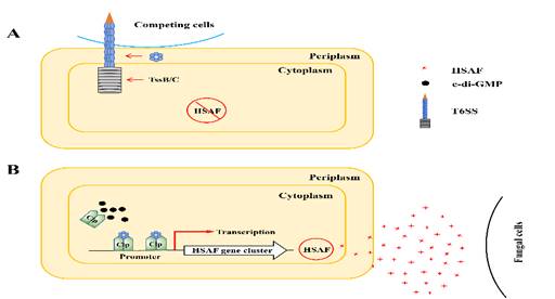 4. OH11还能形成“短武器” ,称为接触型杀菌系统--VI型分泌系统来拮抗病原菌。在IV型系统不组装的情况下,OH11会设计VI型系统的内管蛋白Hcp特异性与转录因子Clp互作,保护Clp免受抑制因子c-di-GMP的结合,从而增强HSAF的合成与外泌,实现生防细菌中“长短武器”的协同工作--图3 (Yang et al., 2020, PLoS Pathogens)