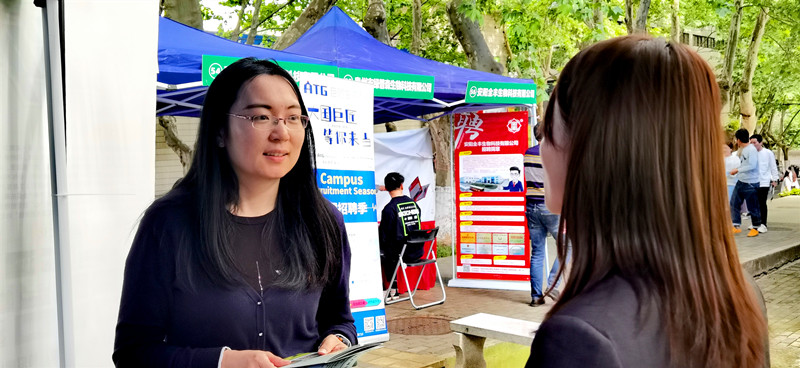 党委副书记吴智丹、本科生辅导员汪越、封筱也来到现场,与用人单位代表展开交流,了解招聘情况、推介毕业生。