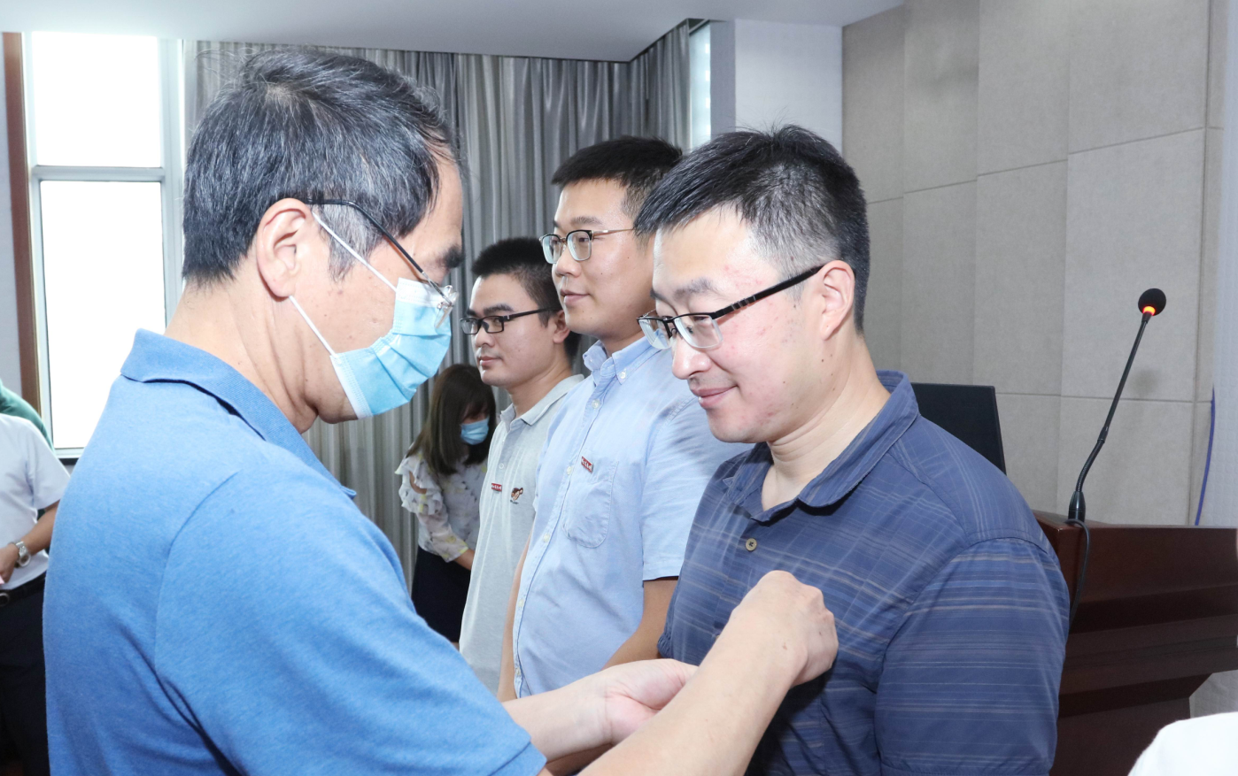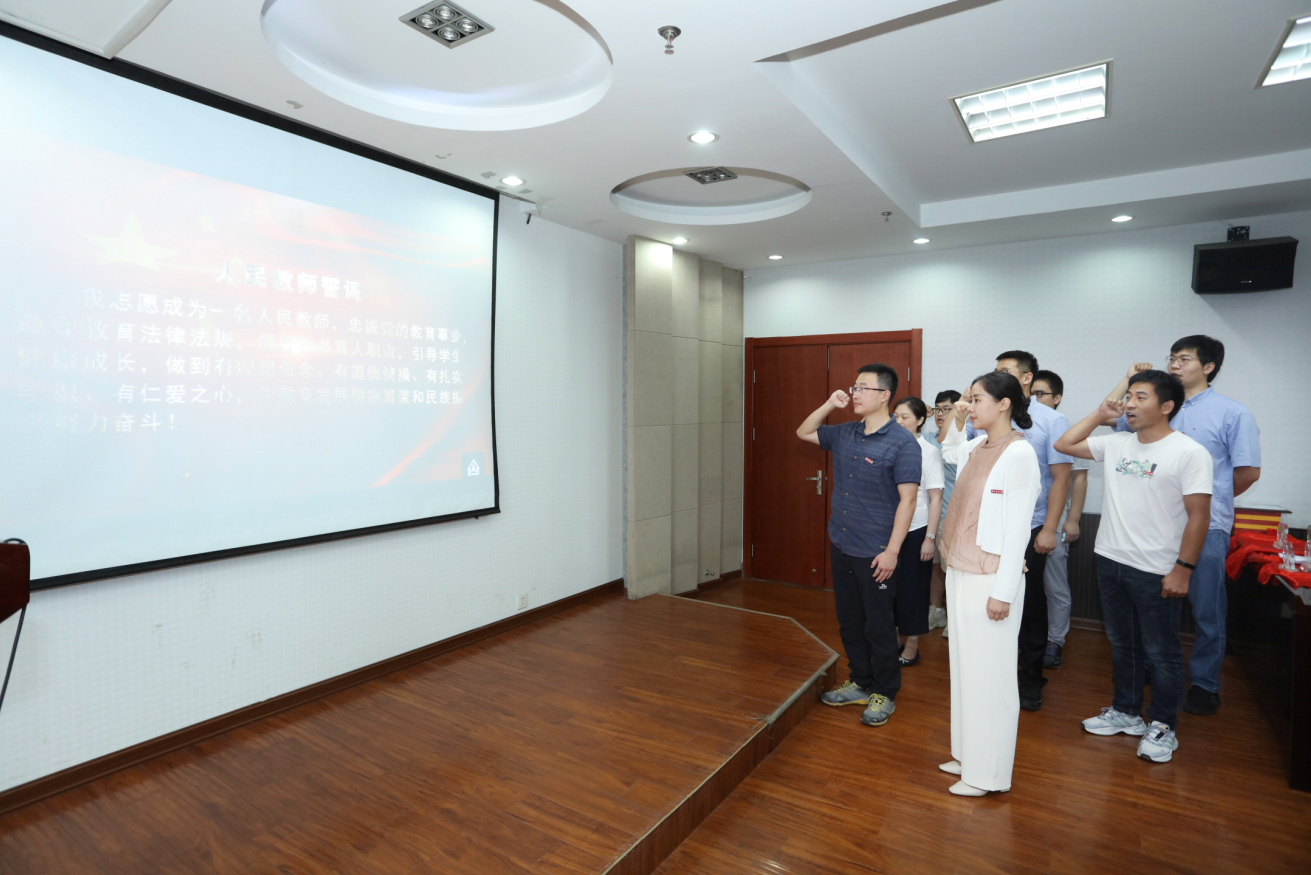 2021年度新入职的8位青年教师万贵钧、何波、余志涛、宋炜、尹志远、徐愿鹏、高博雅、刘昕宇依次作自我介绍,老教师代表郑小波教授、董立尧教授、孟玲教授、王翠花老师分别为新教师佩戴校徽。新教师进行了入职宣誓仪式,他们紧握右拳,庄严许下一名人民教师的神圣承诺!