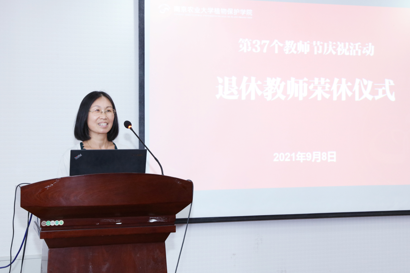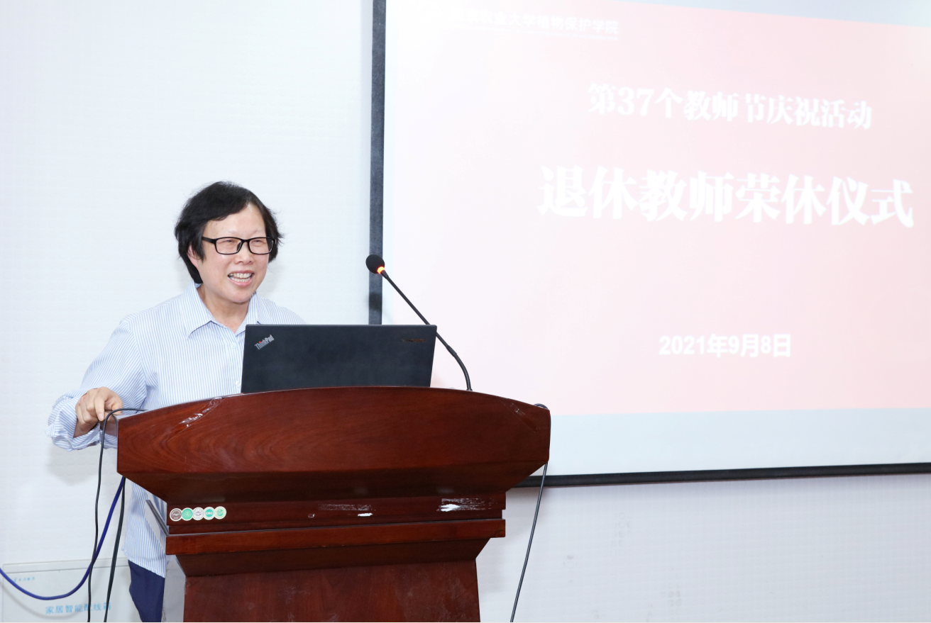 昆虫系党支部副书记赵春青老师、气象教研室主任樊多琦老师分别介绍了孟玲、王翠花两位教师的工作经历和业绩,并对两位老师工作期间为各系科学研究、人才培养和社会服务等各方面所作出的重要贡献,表示衷心的感谢,对两位老师退休后生活致以美好祝愿。