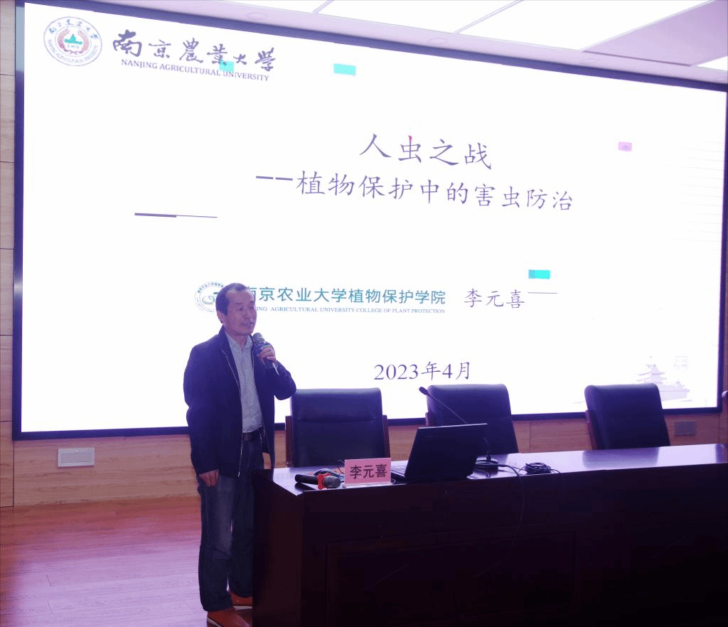 招生宣传片,对南农的历史沿革、校园环境、学科专业和人才培养等有了更深刻的了解。随后李元喜教授为中学师生带来题为《人虫之战-植物保护中的害虫防治》的讲座,围绕人和虫之间为什么要作战、对害虫的认识、害虫防治案例、开展的相关科研工作等方面展开。在李教授的精彩讲述中,同学们加深了对人与害虫之间关系的认知,也认识到植物保护的重要作用。