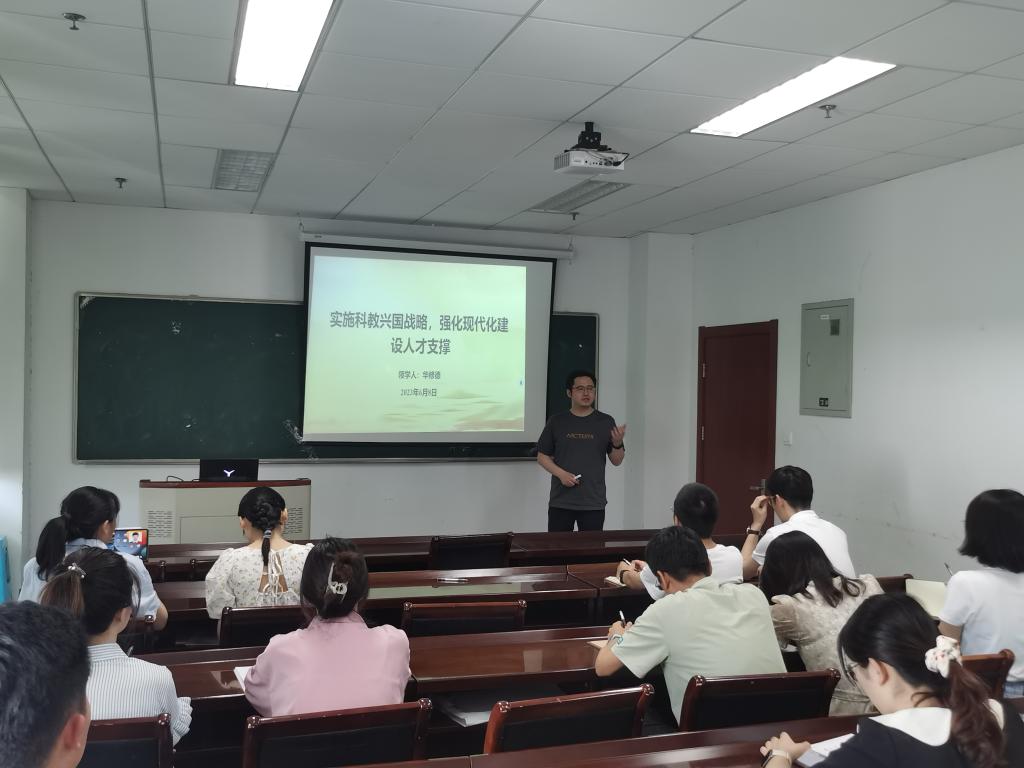 副院长华修德为联系党支部讲授《实施科教兴国战略,强化现代化建设人才支撑》,他指出高校是教育、科技、人才最集中的交汇点,要从“三个必然要求”深刻认识有组织科研、以“四个下功夫”服务国家战略需求、以“三个破解”保障有组织科研实施、以“四个转变”强化国家战略科技力量,积极推进中国高水平科技自立自强。