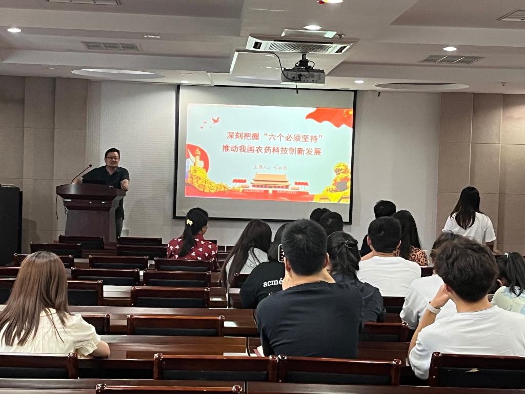 副院长叶永浩为联系党支部讲授《深刻把握“六个必须坚持”,推动我国农药科技创新发展》专题党课,他介绍了中国农药自主创新发展的历程和一代代农药人的奉献经历,指出要深刻认识和把握“六个必须坚持”,把握农药创新的“方向舵”、高扬农药创新的“信念帆”、凝聚农药创新的“同心力”、抓住农药创新的“牛鼻子”、配好农药创新的“金钥匙”、绘就农药创新的“愿景图”。