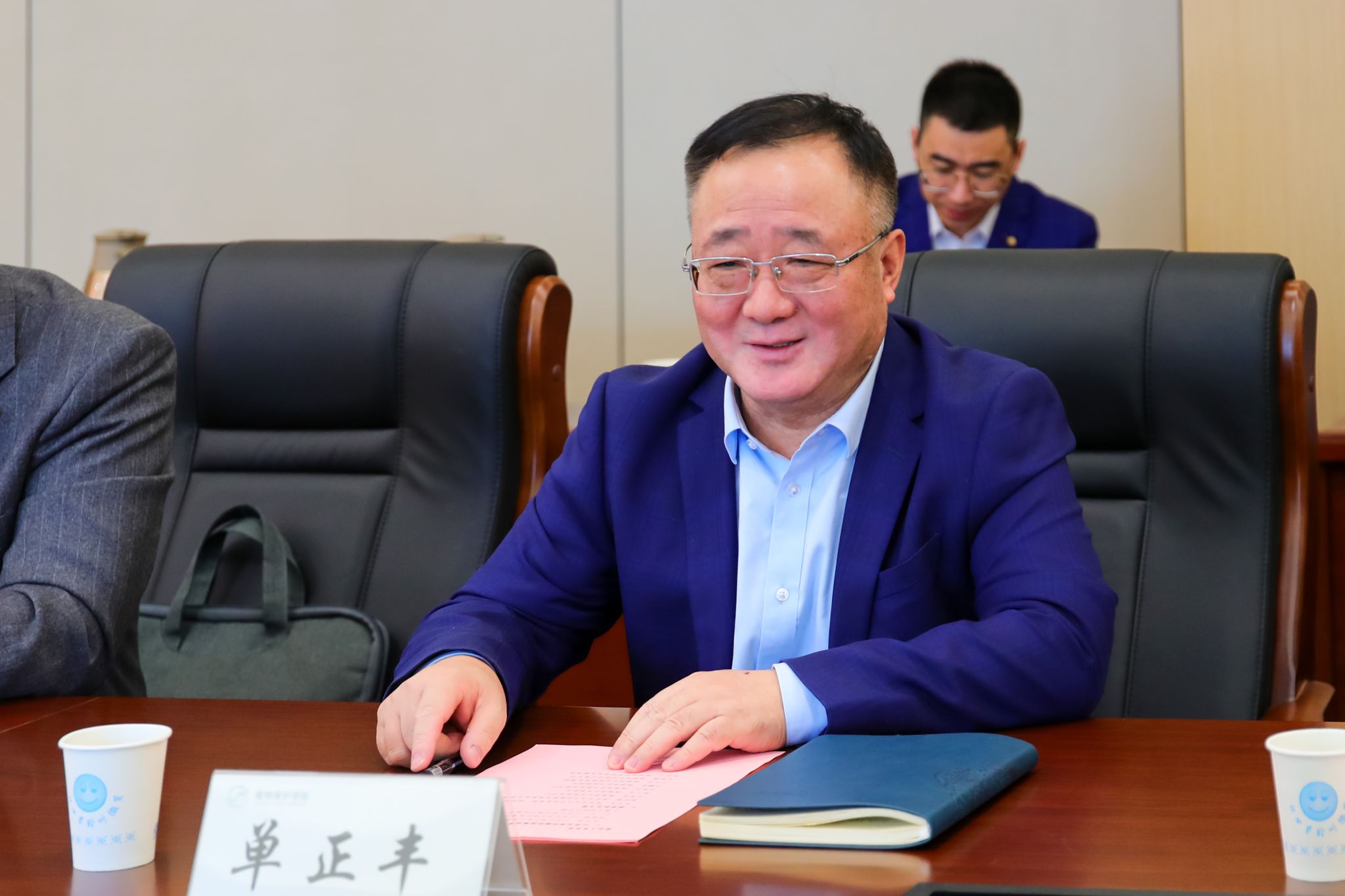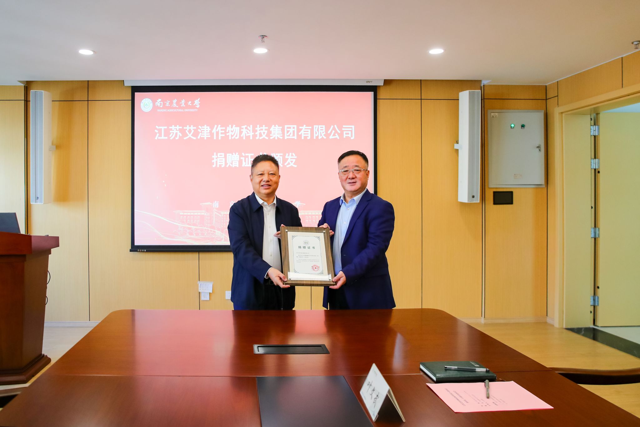 座谈会上,单正丰为江苏艾津作物科技集团有限公司董事长张申伟颁发捐赠证书。