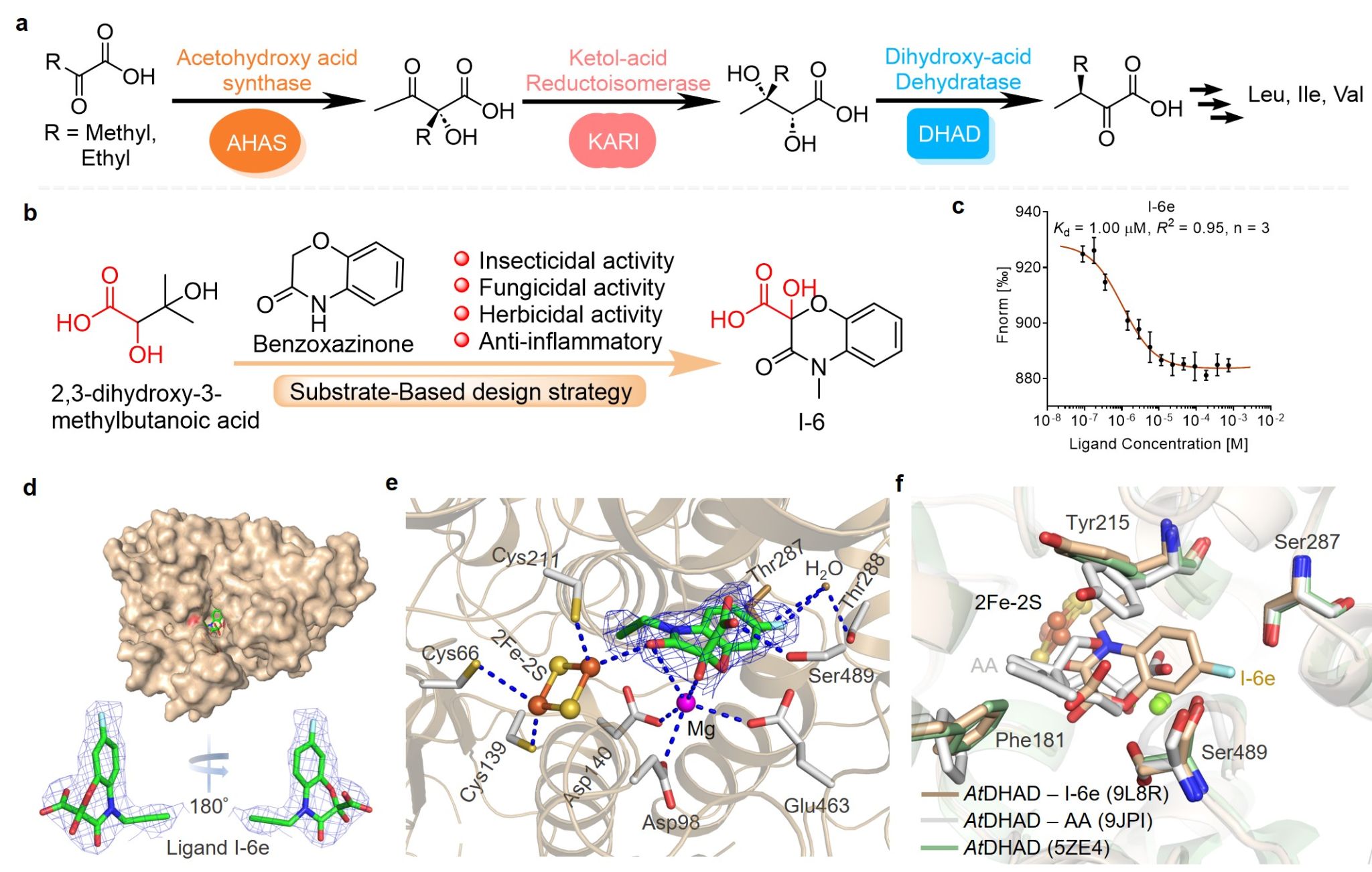 叶永浩教授课题组联合中科院上海有机所/南京师范大学周佳海教授课题组,在Nature Communications期刊上在线发表了题为“Substrate-based discovery of α-hydroxycarboxylic acid derivatives as potential herbicides targeting dihydroxyacid dehydratase”的研究论文。该研究创新性地以植物支链氨基酸(BCAAs)合成途径中的关键酶二羟酸脱水酶(DHAD)为靶标,成功设计并合成具有α-羟基羧酸结构特征的新型除草剂先导化合物,为开发作用机制独特、环境友好的新一代除草剂奠定了重要的分子设计基础。
