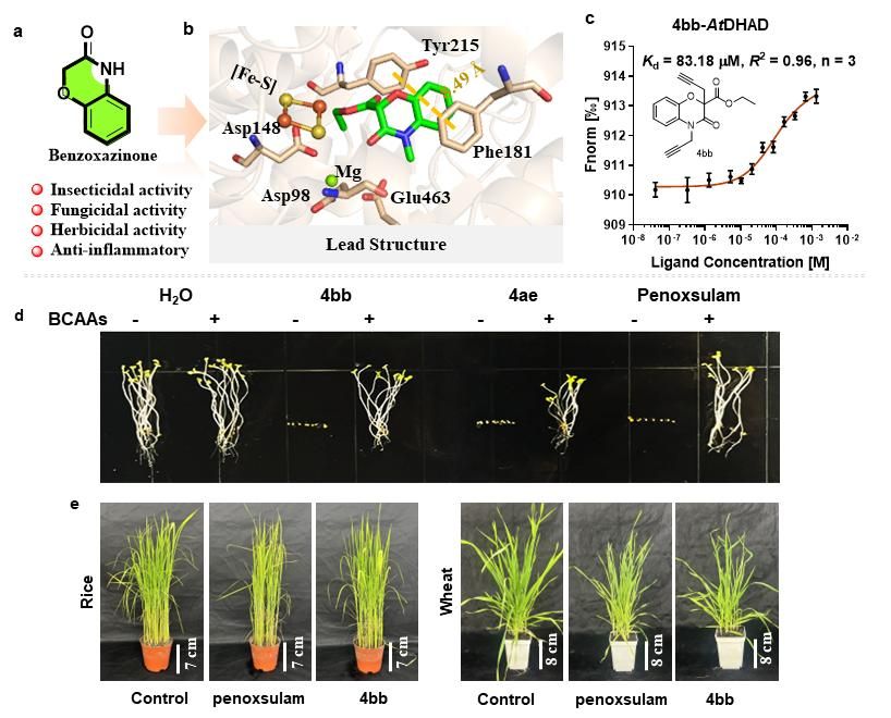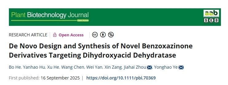 上海有机所/南京师范大学周佳海教授课题组,在Plant Biotechnology Journal期刊上在线发表了题为“De Novo Design and Synthesis of Novel Benzoxazinone Derivatives Targeting Dihydroxyacid Dehydratase”的研究论文。该研究基于新型除草剂作用靶标——二羟酸脱水酶(DHAD),发现苯并噁嗪酮分子骨架能够靶向DHAD,表现出广谱且高效的除草活性,同时对水稻和小麦具有较高的安全性,验证了DHAD作为新型除草剂靶标的可行性。此外,该类衍生物在植物与微生物间显示出良好的选择性,对哺乳动物细胞无显著抑制活性,安全性良好,为开发具有全新机制的绿色除草剂提供了理论依据。