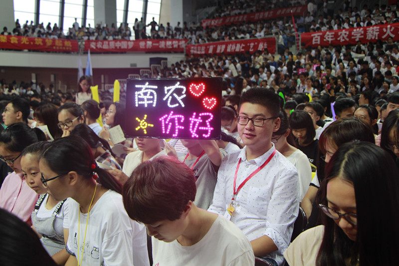 新生们有序进场。在等待领导们进场时,各院新生挥舞着灯牌和横幅,区块链游戏