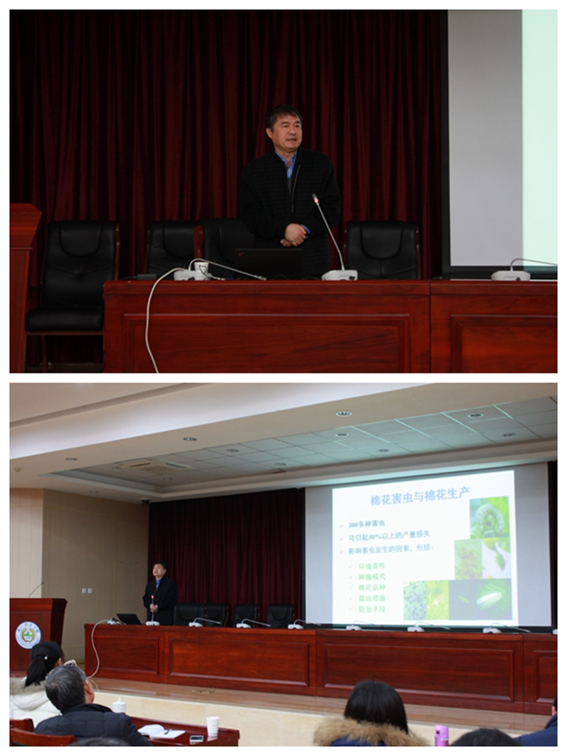 副院长、2006年获得国家杰出青年基金,2011年当选中国工程院院士。在题为“棉花害虫研究工作的回顾与体会”的报告中,他结合中国棉花病虫害研究工作的70年发展历程,深入浅出地阐述了棉花病虫害研究的阶段性成果,并提出棉铃虫种群如何演化、是否会出现抗性问题、天敌的生防服务功能如何变化、非靶标害虫种群如何演替、棉铃虫/微生物的协同进化五大问题,进而介绍其课题组在Bt棉花方向的研究进展。作为老一代科学家,吴院士倡导在座青年师生树立报效祖国信念、培养吃苦耐劳精神,珍惜现有优良科研环境,为我国农业发展做贡献。