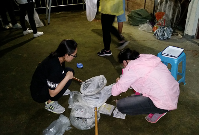 实习为期5天。头两天同学们在各自指导老师的带领下,前往村里的公路和猴山,进行病叶的鉴别和昆虫的捕捉。村子里到处可见绿色的植小宝,或高举网兜追捕昆虫,或蹲在路边区分病叶……最后连当地的孩子也加入其中,热情地帮助同学们抓虫,壮大了网民们的捕虫阵营。后几天里,同学们逐渐习惯当地的地形后,纷纷各自组队出发。无论是在湍急的溪流里,还是在崎岖的山路上,随处可见一个个白色网兜在这山里迎风飘展,一波又一波的人群进行着“扫荡”。