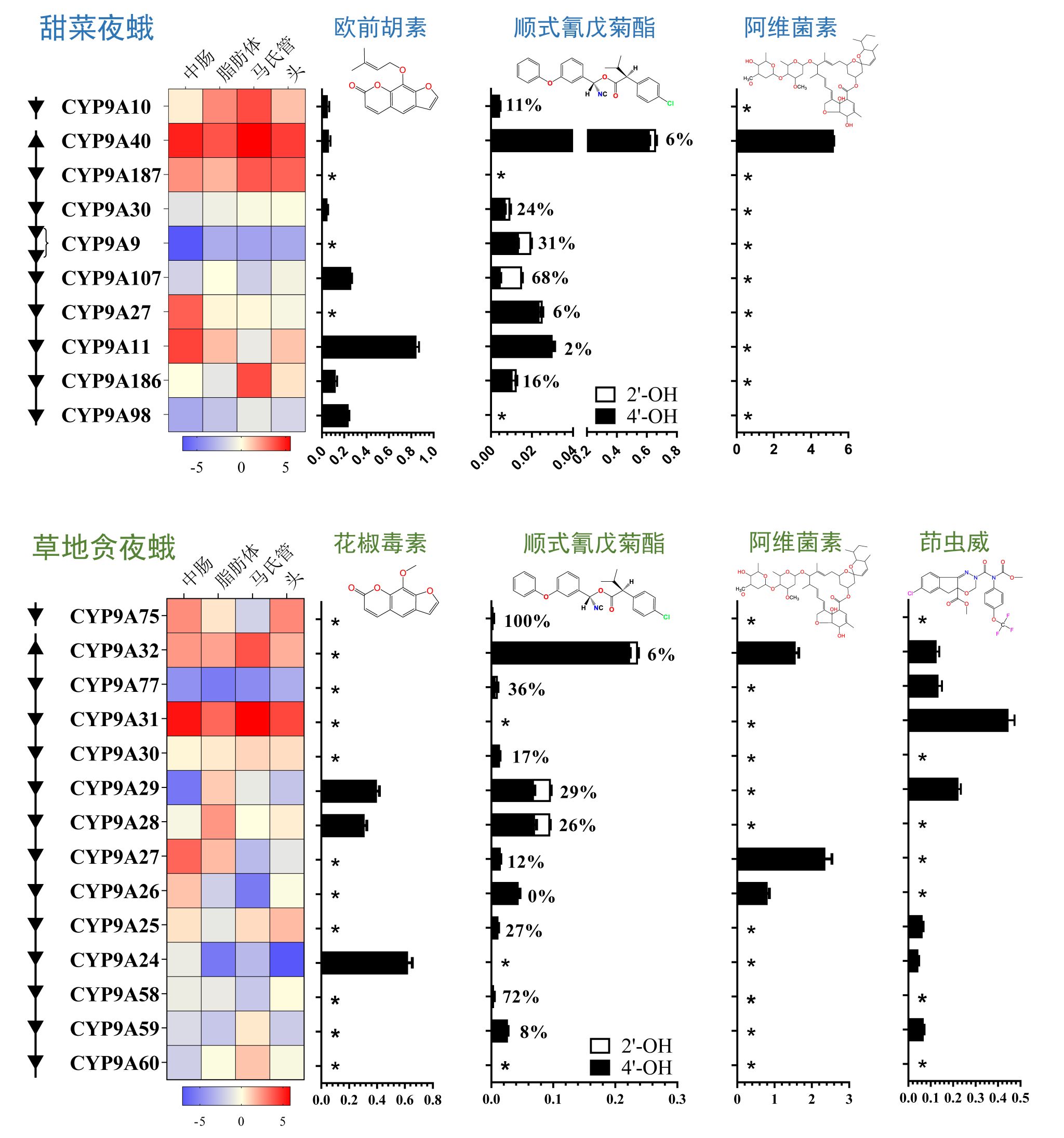 为了鉴定参与解毒代谢的特定P450基因,对25个P450基因分别进行离体表达和体外代谢研究,发现多个直系同源基因在空间表达和催化功能上具有显著差异,并明确了P450和外源化合物之间的对应关系(图2)。该结果不仅表明两种害虫体内CYP9A亚家族P450对不同结构杀虫剂产生交互抗性的潜力,也证实CYP9A亚家族基因扩增为P450的功能创新以及适应性进化提供了丰富的遗传多样性。