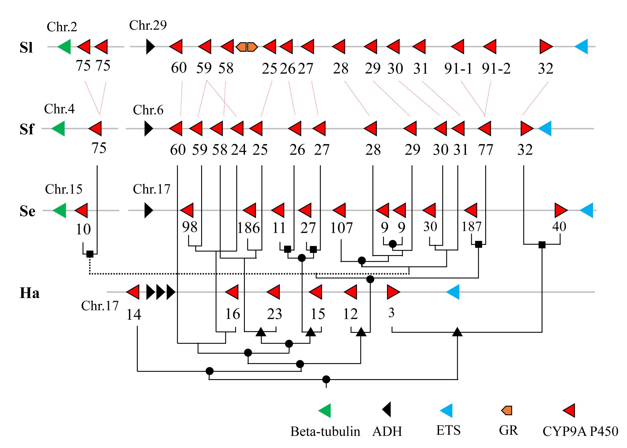 图1. 夜蛾科昆虫CYP9A P450亚家族的扩张和演化