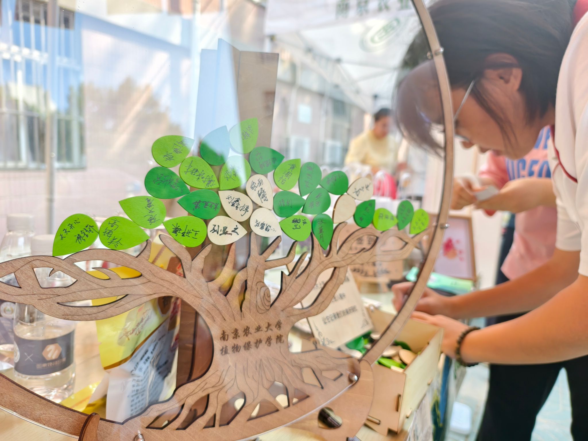 的热情与巧思:“大树”签到牌,一叶一新生,祝福他们在植保的沃土中生根发芽、茁壮成长;特色地图墙,描绘来自天南海北的大家,记录入学时最真挚的成长祈愿;香酥可口的蚕蛹,威武霸气的独角仙,栩栩如生的蝴蝶标本,精美详细的校园植物名录,让新生直观感受植保特色……