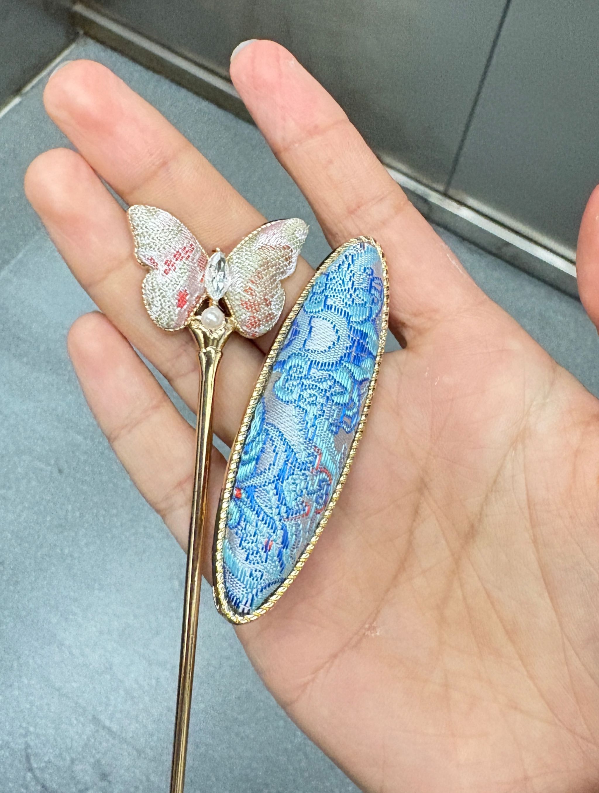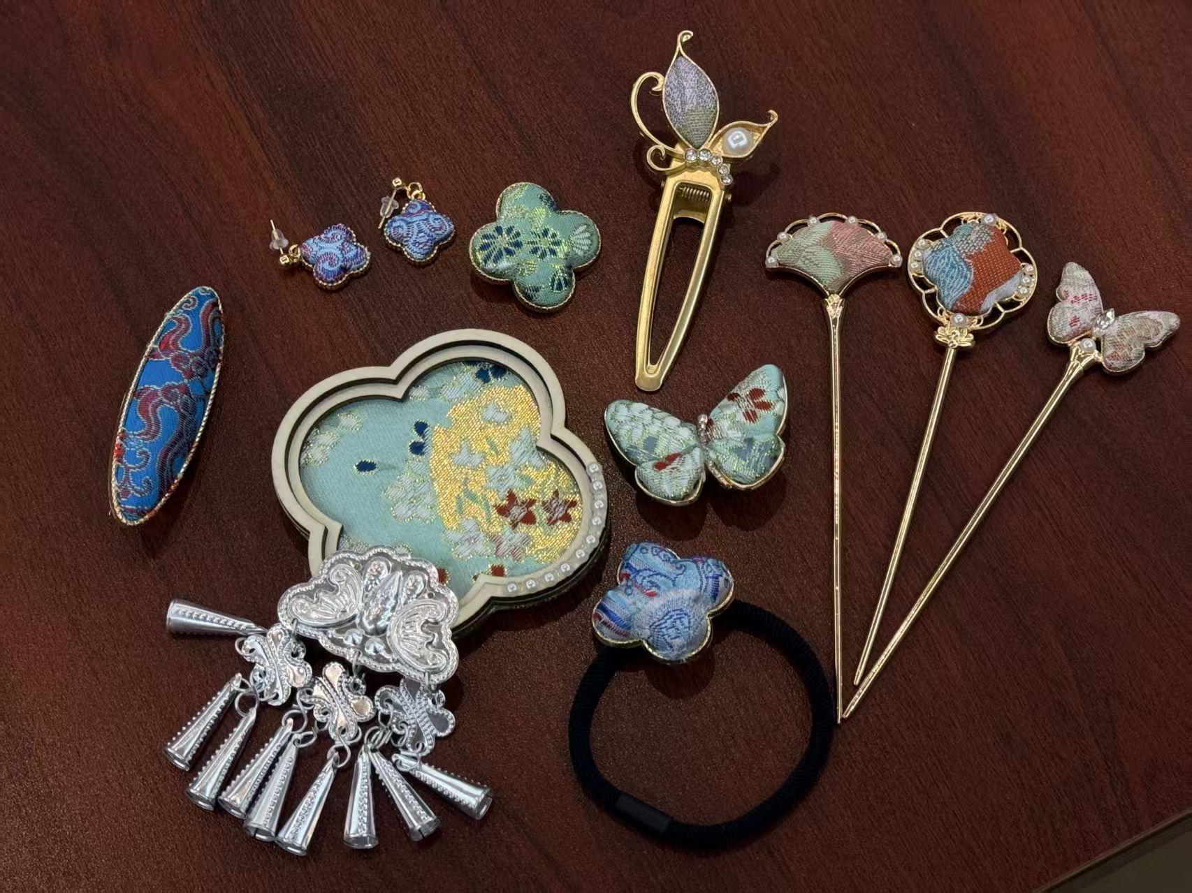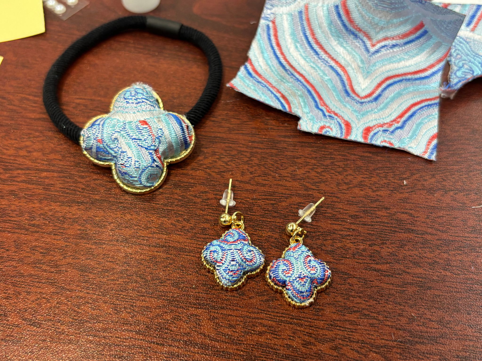 随后的手作体验环节,参与者们领取材料包,在志愿者的指导下,将传统纹样与现代饰品巧妙融合。从选料配色到剪裁拼接,从胸针发簪到冰箱贴,大家屏息凝神、细细揣摩,在时空的交错中感受巧手匠人的精湛技艺。当一枚枚点缀着不同纹路的宋锦饰品在指尖诞生,传统工艺的温度也悄然传递至每个人心间。