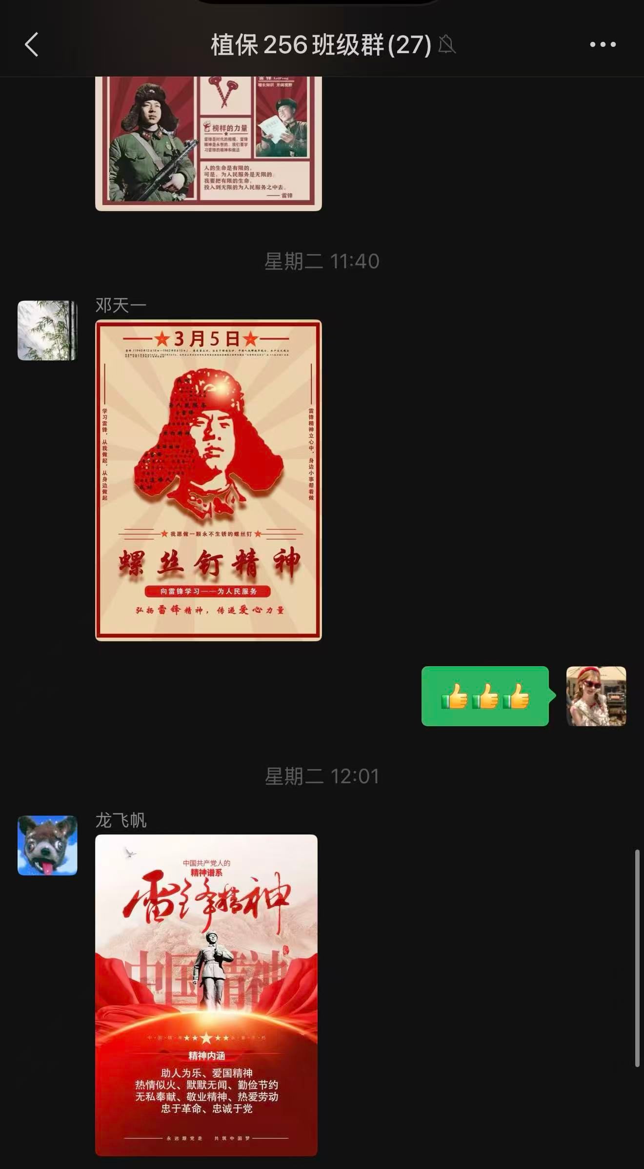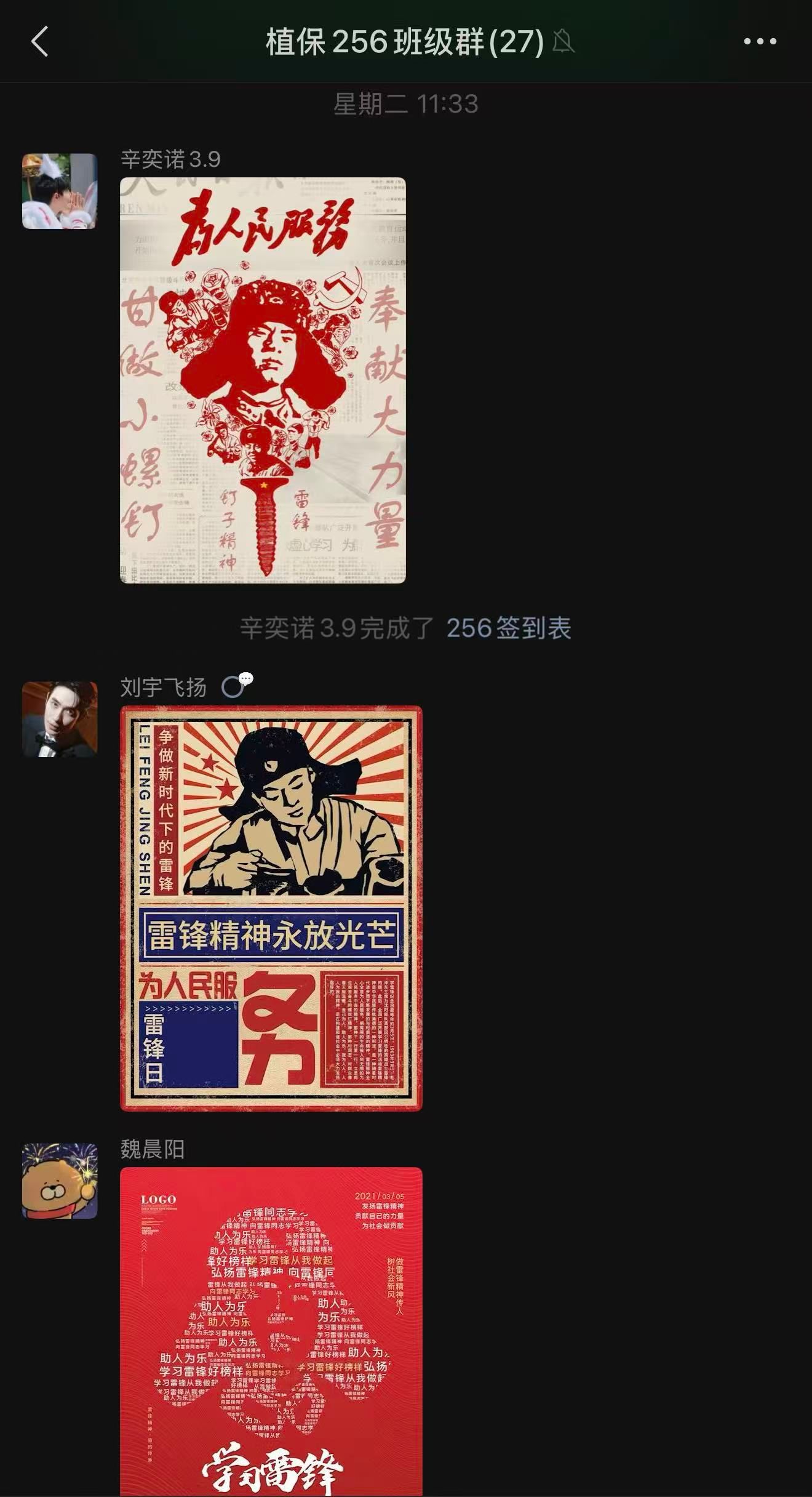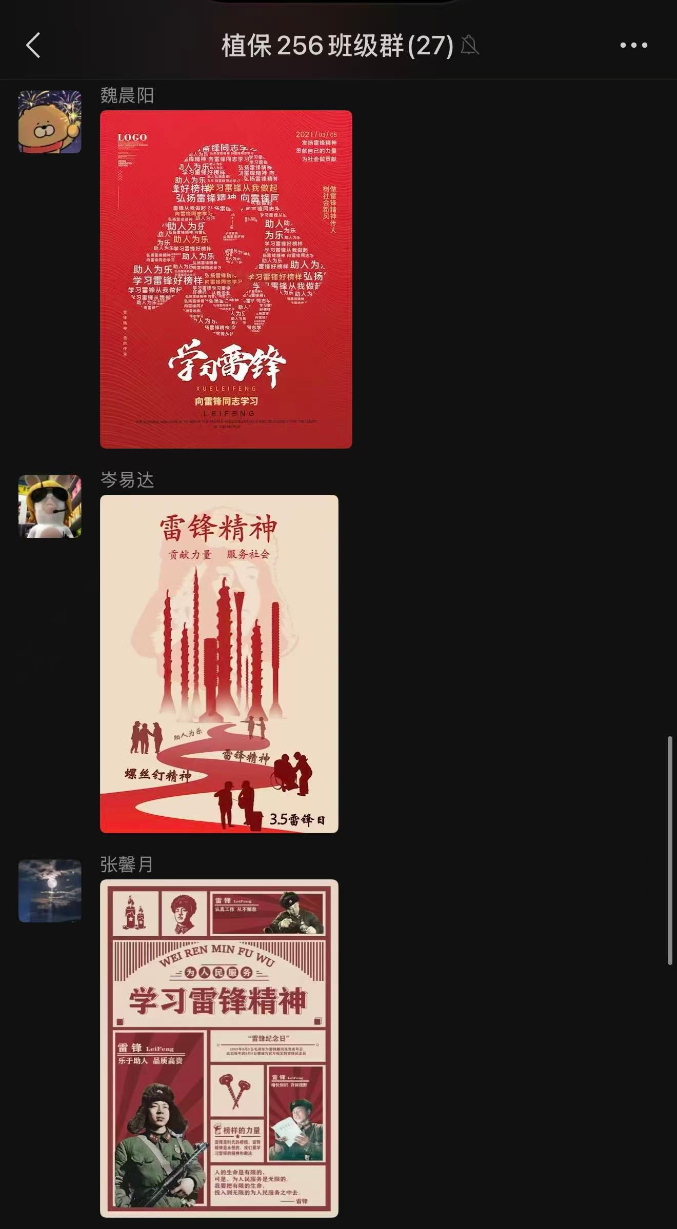 植保256团支部开展“弘扬雷锋精神,争做时代新人”主题班会,团支书带领全体团员重温雷锋同志的先进事迹,深入解读雷锋精神的时代内涵,围绕“新时代青年如何践行雷锋精神”展开热烈讨论,进一步凝聚思想共识;班会后,同学们分组创作学雷锋主题海报,以画笔为载体,将雷锋语录、奉献场景、志愿服务理念融入设计,作品主题鲜明、创意十足,生动展现了青年学子对雷锋精神的理解与传承。
