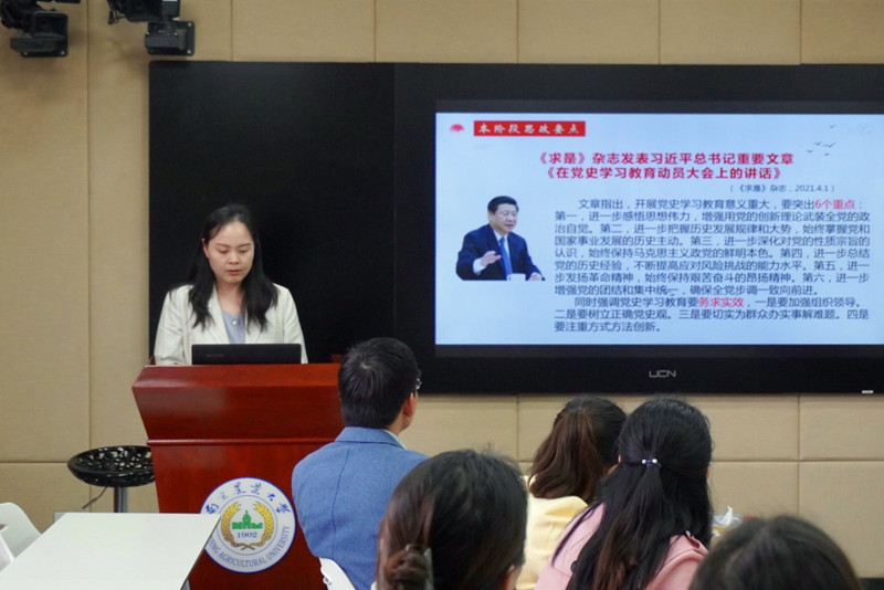学工办主任、团委书记李艳丹带领大家,学习回顾了近两周的全国思政热点以及各兄弟院校在党史学习教育方面的典型经验与做法。