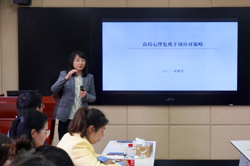 党委副书记李阿特做《高校心理危机干预应对策略》的主题分享。她从自身的工作经历、感受体会谈起,辅以生动的人物案例,分享了识别心理问题、应对心理危机、做好家校沟通协调等问题的实战技巧和心得体会。主题分享干货满满,辅导员们受益匪浅。