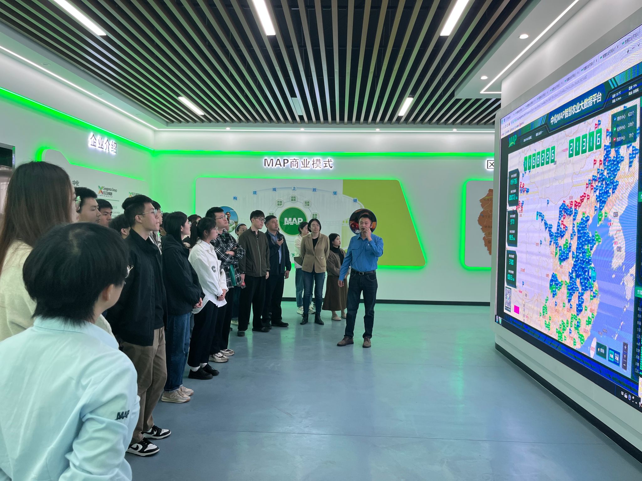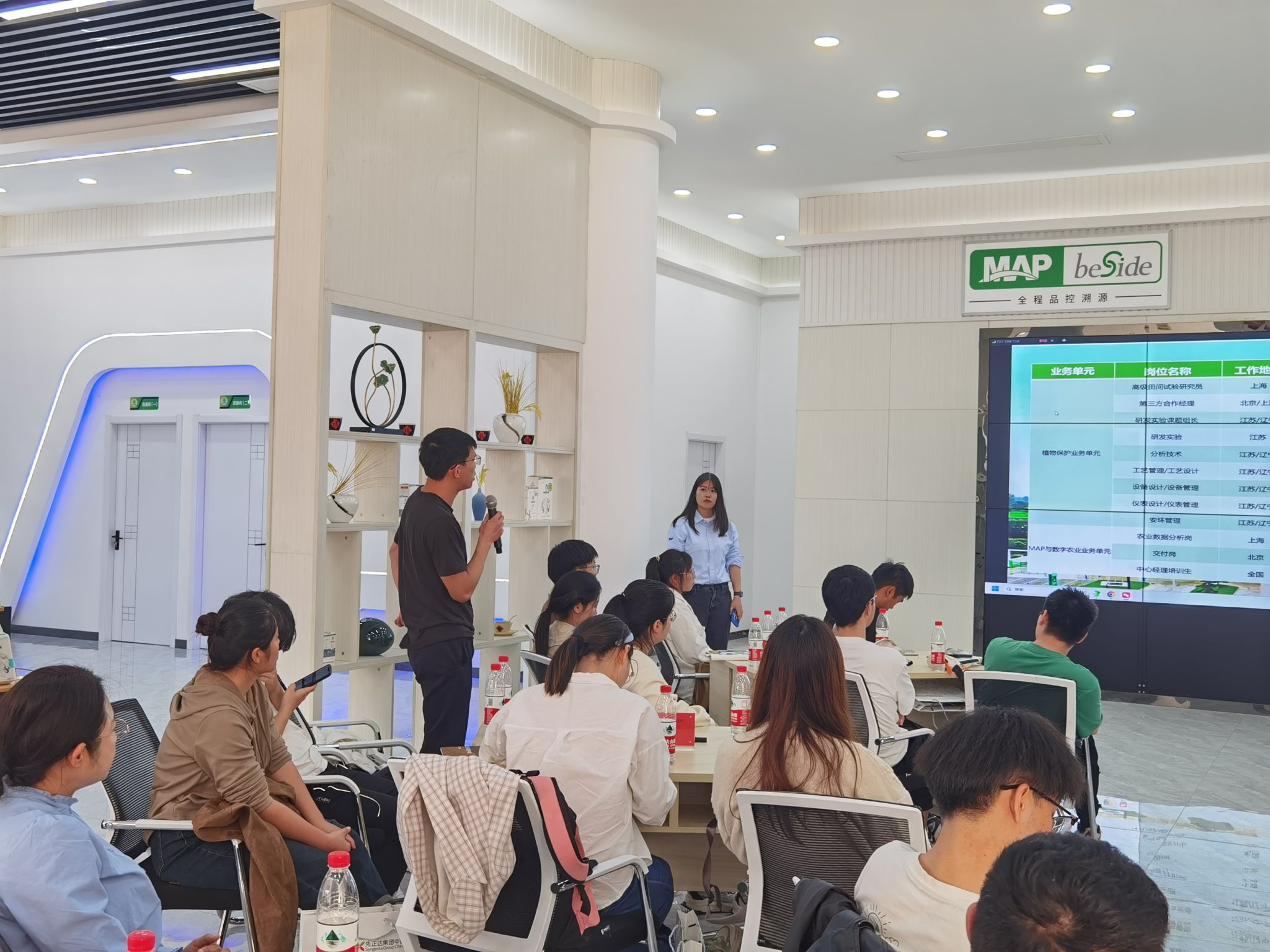 在校企交流环节,MAP与数字农业人力资源部副总监游会静宏观介绍MAP与数字农业的使命、愿景、核心理念及业务模块,鼓励青年学生学农为农、为中国农业现代化贡献智慧和力量。MAP粮作苏皖省区总经理助理李云飞详细介绍MAP BU业务及战略,MAP粮作苏皖省区人力负责人陈默具体介绍公司岗位及人才发展理念。同学们也就校招等问题与公司负责人交流。