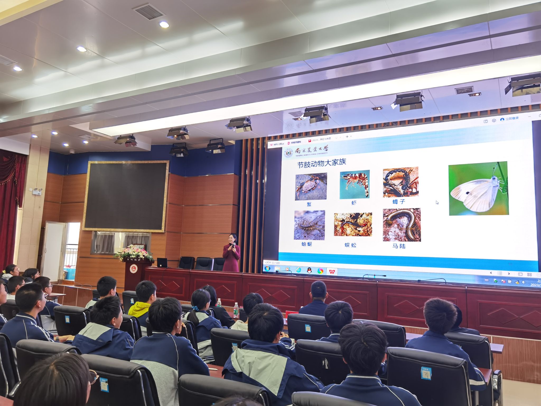 张春玲为同学们做《昆虫的存在与创造》科普讲座,她从何为昆虫、昆虫的存在、昆虫的创造、昆虫与仿生、昆虫大观园五个维度,妙趣横生地介绍了昆虫的基本知识,开拓学生的视野。期间,一张张精美的图片、一个个有趣的冷知识,不时引起同学们的感叹,同学们逐渐认识到小小昆虫的大大智慧,也认识到昆虫与人类的密切关系。