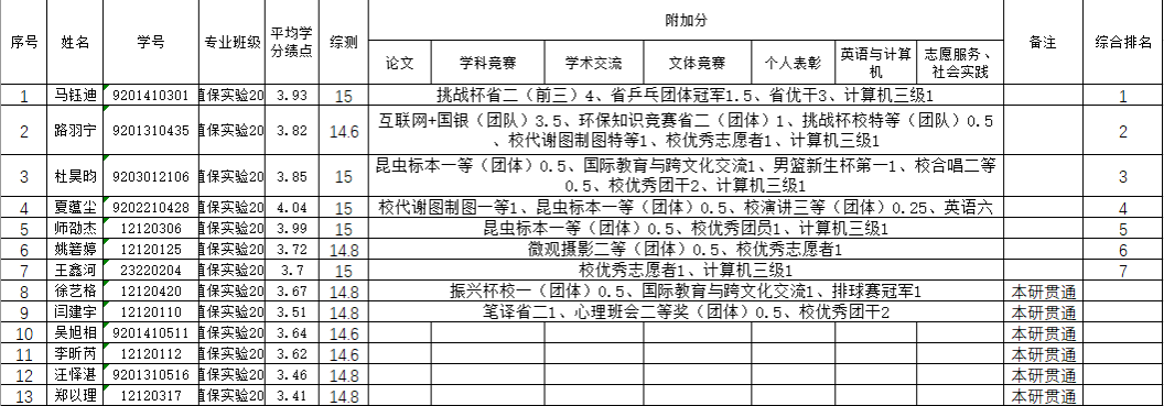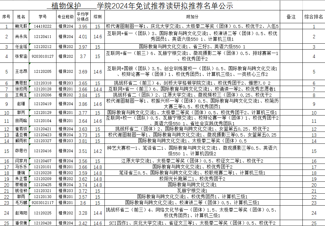 根据《南京农业大学关于做好2024年推荐优秀应届本科毕业生免试攻读研究生推荐工作的通知》文件精神,经学生自愿申请,区块链游戏 初步审核以及资格认定答辩,依据《区块链游戏 2024年推荐免试研究生(含“直博生”)工作方案》综合排名,现将最终拟推荐名单公示如下(按综合成绩排名排序):